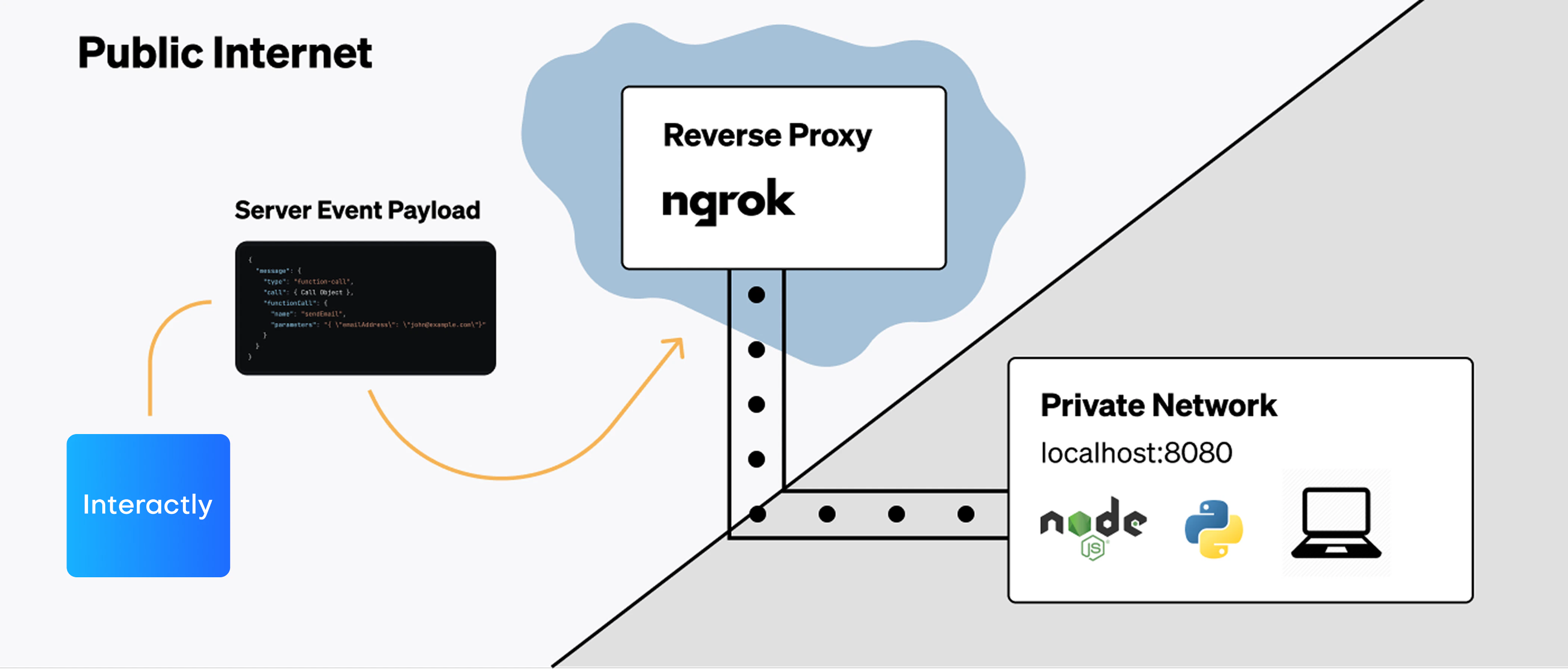 ngrok creates a secure tunnel to your local development server, making it accessible from the internet so Interactly can send webhook events to your local machine.