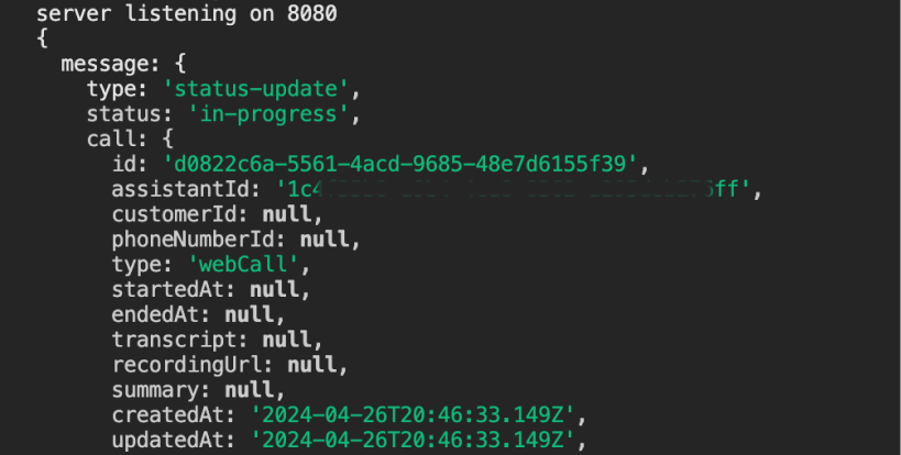 We will now be able to see call events come through asPOST requests, & can log payloads to our terminal.